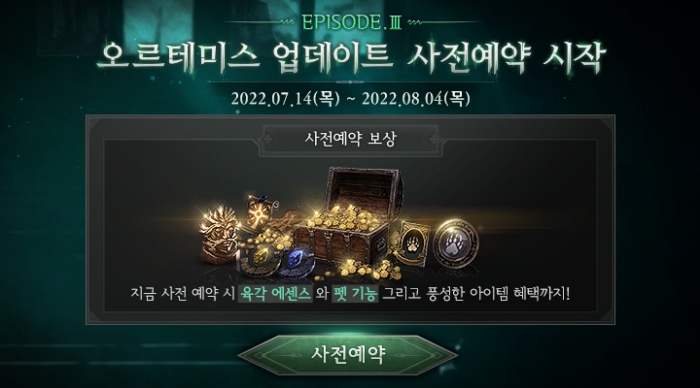 ... 프리뷰 페이지에서 에피소드 III의 주요 스토리와 신규 보스, 신규 맵을 살펴볼 수 있다. 동시에 사전예약을 진행할 수 있다. 7월 14일부터 8월 4일까지 가능하며 사전 예약 혜택으론 스킬 룬 육각 에센스 1개, 펫 교환권 1장, 펫 기능 7일, 100만 골드, 링크