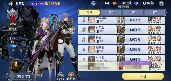 ... 최고의 유저들이 격돌하는 결투장의 네 번째 시즌. 최고의 유저들은 누구인지 확인해보자. * 종료 60분~20분 내외의 시각을 기준으로 기록한 것으로최종 순위와 다소 차이가 있을 수 있습니다