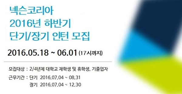 ...이후 넥슨은 서류전형과 면접 과정을 거쳐 6월 16일 최종 합격자를 별도로 안내할 예정이다. 이번 여름방학 인턴은 2016년 7월 4일부터 8월 31일까지 약 2개월 간, 하반기 인턴은 7월 4일부터 12월 30일까지 약 6개월간 현업에서 실무경험을 쌓을 수 있으며, 추후 넥슨 입
