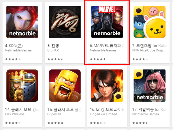 ... 출시 전부터 100만명이 넘는 사전예약자를 모집하며 기대를 모았던 이 게임은 구글플레이보다 애플 앱스토어에서 높은 순위를 기록해 이번주 차트에 이름을 올렸다. 이처럼 이번 주는 캐주얼게임이 강세지만 넷마블의 RPG '마블퓨쳐파이트'는 별개다. 이 게임은 영화 '시빌워'의