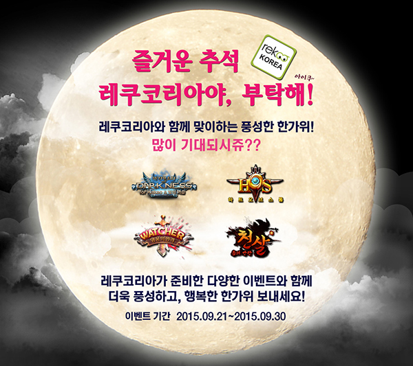 ... 또한, 레쿠코리아는 ‘즐거운 추석 레쿠코리아야, 부탁해!’를 친구들에게 공유하고, 친구들이 공유한 URL을 통해 많이 참여한 순으로 50만원 상당의 게임 캐쉬(1명), 구글 플레이 기프티권 10만원(2명), CJ 외식상품권 5만원(3명), 스타벅스 아이스 아메리카노(20명)를