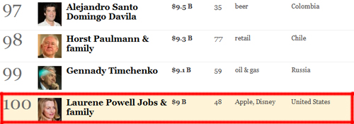 ... 포브스가 제공한 자료에 따르면 올해 새로 억만장자에 등록된 128명 중 지난해 남편 잡스의 사망으로 90억 달러(한화 약 10조 원) 상당의 자산을 갖게 돼 현재 실리콘밸리 여성 가운데 최고 부자로 거듭났다. 또한동시에 여성 자산가중에서는13위를 차지했다. 로런 파월은 현