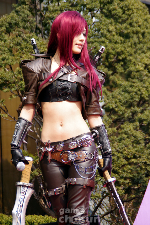 ... 10일 용산 나진전자 본관 앞에서 진행된 나진엠파이어 프로게임단 통합 창단식에서 나진엠파이어의 공식 서포터가 된 전문 코스프레 팀 스파이럴캣츠가 새로운 의상을 선보이고 있다. 사진은 스파이럴캣츠의 '타샤' 오고은 양이 리그오브레전드의 챔피언 카타리나로 분한 모습. [이