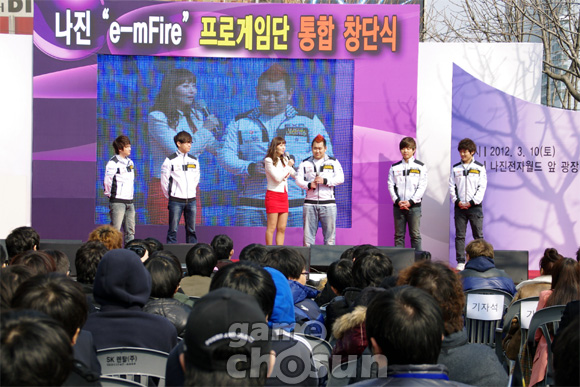 ... 이날 행사장에는 쌀쌀한 날씨에도 불구하고 약 300여명의 팬들이 몰려 나진엠파이어의 창단식을 지켜봤다. ▲ 행사장 입구에 놓인 나진엠파이어 배너 ▲ 나진엠파이어 '막눈' 윤하운의 미소 ▲ '모쿠자' 김대웅이 무대입장을 기다리고 있다 ▲ 나진산업,이노베이션