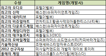 ... 스카이림의 토드 하워드 디렉터는 "지난 25년간 베데스다의 결과물로 상상하지 못한 (수상)축하를 받게 됐다"고 소감을 전했다. 벨브사의 '포탈2'는 최고의 오디오, 내러티브, 게임디자인 상을 수상하며 3관왕에 올랐고 슈퍼자이언트게임즈의 '배스천'도 최고의 신작고 최고의