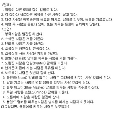 ... 질문은 전제와 조건을 주고 마지막 '금붕어를 키우는 사람은 누구일까?'라는 문제의 답을 맞추는 것이다. 정답은 독일인. 하지만 다소 복잡하고 난이도 있는 문제에 네티즌들은 "정말 어렵다" "종이에 안쓰고 맞추기란 불가능" "푼 사람 있으면 댓글 좀"등의 반응을 보였다