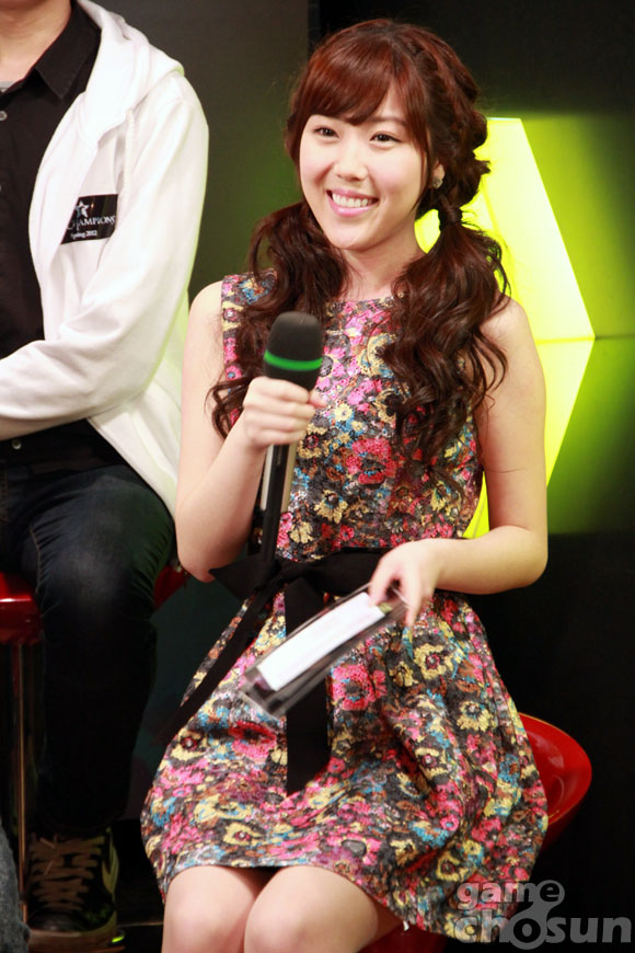 ... 2일 용산 e스포츠 상설경기장에서 리그오브레전드의 첫 정규리그 'LOL더챔피언스' 오프라인 예선 2일차 경기가 열리고 있는 가운데, 알록달록한 드레스를 입은 민주희 양이 두 번째 경기 승리 팀 NEB를 인터뷰하며 웃음을 보이고 있다. [이시우 기자 siwoo@chosun.
