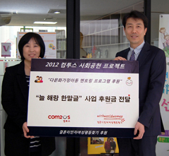 ... 컴투스가 다문화가정 아동들에게 한글교육 프로그램을 지원하기 위해 한 여성지원단체를 방문했다. 컴투스(대표 박지영)는결혼이주 여성 지원 단체 '결혼이민자여성평등찾기'(대표 김혜련)가 주관하는 다문화가정 아동 멘토링 프로그램인 '늘 해랑 한말글' 사업을 후원하기 위해 28일'