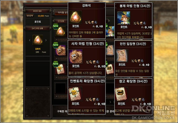 ... 이번에 공개된 포인트 샵은 강화 확률을 높여주는 강화석, 능력치를 올려주는 봉제 마법 인형, 사자 마법 인형, 인벤토리 확장권, 창고 확장권, 던전 입장권 등 게임의 편의성을 높여주는 아이템 위주로 공개됐다. 이와 함께 원활한 테스트를 위해 현재 테스트중인 모든 테스터에게