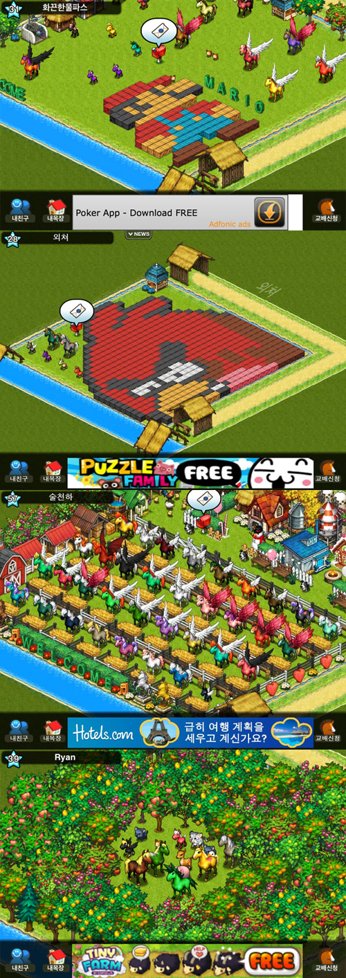 ...'더비데이즈' 유저들은 게임 플레이를 통해게임 소재만큼이나 톡톡 튀는 아이디어와 재치를 보여주고 있다는 것. 스크린샷 속 '더비데이즈' 유저들의 목장은 '앵그리버드'나 '슈퍼마리오' 캐릭터 모양 인테리어로 꾸며져 있기도 하고, 특정 외형을 가진 말들로 가득한 경우도 있다.