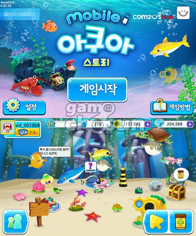 ... △스마트폰용 아쿠아스토리 스크린샷 글로벌 모바일게임 퍼블리싱 사업은 국내 게임사의 모바일 게임 신작의 해외 진출을 돕기 위해 총 20억에 달하는 마케팅 비용을 지원하는 사업으로 한국콘텐츠진흥원과 게임빌, 컴투스가 주관한다. 개발사 8할, 퍼블리셔 2할의 개발사에 유리한