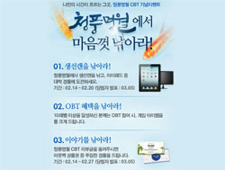 ... '청풍명월'의 비공개 테스트를 기념하기 위한 이벤트도 함께 진행된다. 유저가 게임 내 생선 캔을 낚고 이를 웹에서 응모하거나 테스트 후기를 남기면 추첨을 통해 아이패드2, LED 모니터, 참치세트 등의 경품을 증정한다. 또한 10레벨을 달성하는 모든 유저에게는 정식 오픈