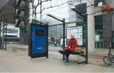 ... 공개된 첫 번째 사진에는 버스 정류장으로 보이는 곳에 의자가 놓여있고 바로 옆에 파란색 전광판이 설치 돼 있다. 정류장에 아무도 없을 때는 전광판에 0이라고 적혀있다. 두 번째 사진에는 아무도 없는 정류장에 한 여성이 의자에 앉았다
