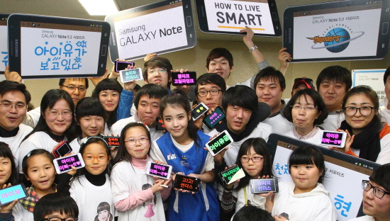 ...서울 잠실 실내체육관에서 11일 열렸던 프로농구 삼성 썬더스 대 동부 프로미 경기에서 갤럭시 광고 모델 아이유와 ‘갤럭시 노트 5. 3 서포터즈’가 힘찬 응원을 다짐했다. 이날 경기에서 서포터즈는 ‘갤럭시 노트’의 5