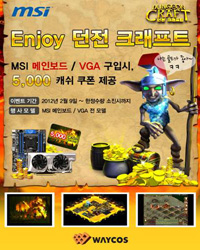 ...더나인코리아(대표박순우)는 MSI의 한국 공식 디스트리뷰터 웨이코스(대표 고민종)와 함께 자사가 서비스하는 전략 웹게임 '던전 크래프트'의 프로모션을 실시한다고 9일 밝혔다. 이번 프로모션은9일부터 제품 품절될 때까지 이용자가 MSI의 메인보드와 그래픽카드를 구입하면 '던전 크