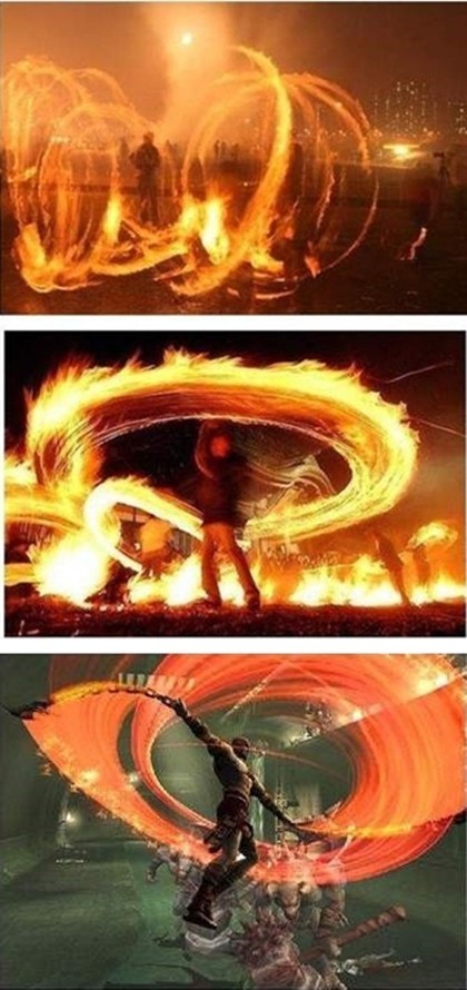... 이중 2장의 사진 속에는 사람들이 우리의 전통놀이 중 하나인 '쥐불놀이'를 하는 장면이 담겨 있다. 나머지 1장에는 PSP 게임 '갓 오브 워' 속 주인공 크레이토스가 적을 향해 검을 휘두르고 있는 장면이 담겨 있다. 그런데 이 캐릭터의 공격 장면이 쥐불놀이를 즐길