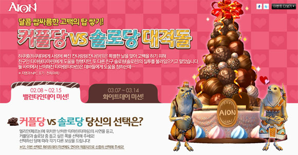 ...엔씨소프트(대표 김택진)의 국민 MMORPG '아이온'이 다가오는 밸런타인데이를 맞아 8일부터 이벤트인 커플당 대 솔로당 대격돌 이벤트를 실시한다. 이번 이벤트에서는 커플당과 솔로당 중 자신의 진영을 선택해 캐릭터를 꾸밀 수 있는 모자 액세서리와 버프 아이템을 지급 받아자신이