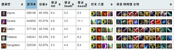 ... 이어 2위는 팀의 꽃인 마법사(28%)가, 3위는 전투적인 의지가 강한 탱커(23%)가, 4위에는 성장하는 챔프 정글러(15%)가 순위에 올랐다. ▲ 지난 6일 공식 홈페이지에서 펼친 선호하는 챔피언 투표 결과 'LOL' 한국 서버의 챔피언 순위와 기록을 보여주는 웹