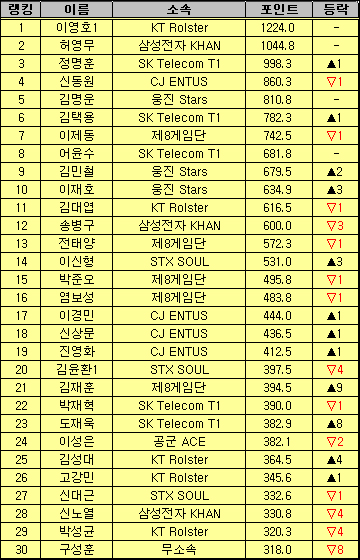 ... 이영호는 프로리그에서 4승 무패행진을 이어가며 1,224. 0점으로 랭킹 1위를 유지했다. 2위는 지난 달에 2위에 오른 허영무(삼성전자칸)가 1,044