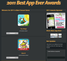 ... 올해는 전 세계 약 110만 유저들이 투표에 참여해 총 109가지 카테고리에서 1,692개 앱에 대한 순위를 내렸다. 특히, 그동안 애플 앱스토어 부문만 수상했던 기존방식에서 벗어나 처음으로 애플 앱스토어 부문과구글 안드로이드부문으로나눠 최고의 앱을 선정했다. 이 가운