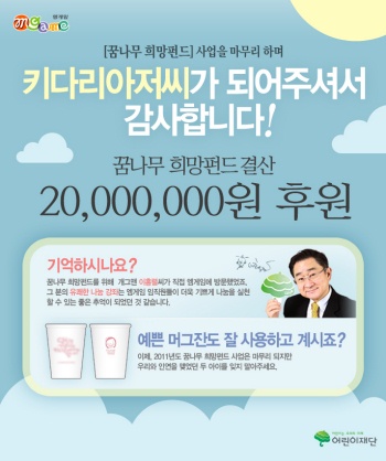 ...글로벌 게임 포털 엠게임(대표 권이형)은 소외계층 아동의 재능계발을 지원하는 '꿈나무 희망펀드' 기금 총 2,000만원을 NGO '초록우산 어린이재단'에 전달했다고 1일 밝혔다. 엠게임의 '꿈나무 희망펀드'는 어린이재단과 협약을 맺고 특별한 재능을 보유한 아동을 지원하기 위해