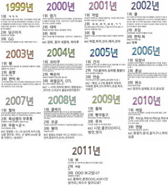 ...가장 인기를 끌었던 인터넷 유행어는 무엇일까? 최근 한 온라인 커뮤니티에는 ‘역대 연도별 인터넷 유행어’라는 제목의 게시물이 올라와 화제다. 작성자는 인터넷이 보급되기 시작한 1999년부터 2011년까지 13년간 온라인에서 인기를 끌었던 유행어들을 선별해 각 연도별로 1
