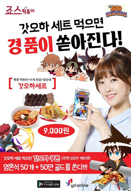 ... ‘갓오브하이스쿨’은 제휴를 기념해 오는 10월 6일(화)까지 해당 메뉴를 주문하는 고객을 대상으로 선착순 5만 명에게 스마트폰 거치대와 아이템 쿠폰을 현장에서 증정한다. 또한 아이템 쿠폰을 게임에서 입력하거나, 갓 오브 하이스쿨 공식 페이스북 이벤트 페이지에 댓글로 게임