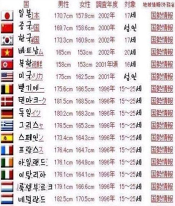... 이번에 공개된 세계 평균 키를 살펴보면 우리나라를 포함해 총 19개국의 남녀 평균 키와 조사 연도, 조사 대상 등이 표기돼 있다. 이 가운데 한국 남성 평균 키는 173. 3cm, 여성은 160