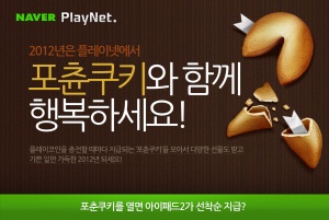 ... 유저들은 지급받은 포춘쿠키를 통해 아이폰4S, 갤럭시S2 LTE, 소니 카메라 등의 경품에 응모할 수 있다. 또한 아이패드2, 백화점 상품권 등이 걸린 선착순 경품 이벤트도 29일 오후부터 참여가 가능하다. 이 외에도 네이버 플레이넷의 개별 게임에서도 설날 프로모션이 실