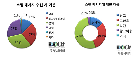 ... 응답자 가운데 32%는 스팸 메시지를 받았을 당시 '불쾌했다'고 답했으며, 27%는 '개인정보 누출경로가 의심스러웠다', '당황스러웠다(12%)'고 답했다. 이런 가운데스팸에 대처하는 사용자들의 소극적인 태도가 문제점인 것으로지적됐다. 이번 조사에 따르면 카카오톡에
