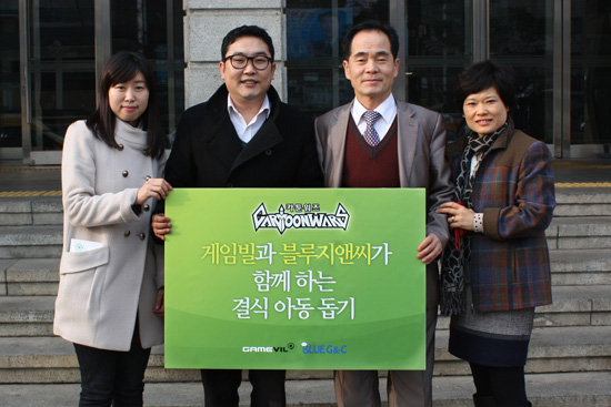 ... 이날 구로구청을 방문한 양사는 구로구의 결식 아동들을 위해 성금을 기탁했다. 게임빌은 자사가 서비스하는스마트폰게임 '카툰워즈' 성공에 감사의 뜻을 전하고자 개발사 블루지앤씨와 함께게임 수익금 일부를 구로구 결식 아동들을 위해기부했다고 회사 측은 밝혔다. 최강우 블루지앤씨대