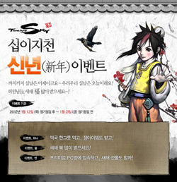 ... 첫 번째 '떡국 한그릇 먹고, 쟁 아이템도 받고' 이벤트는 게임 내에서 사냥 또는 전쟁 시 일정 확률로 획득할 수 있는 '가래떡' 아이템을 모아 제조하면 '떡국' 아이템이 생성된다. 유저는이 아이템을 사용해 방어력 및 숙련도를 상승시켜주는 영물 아이템 '까치'를 비롯해 '까마귀