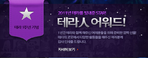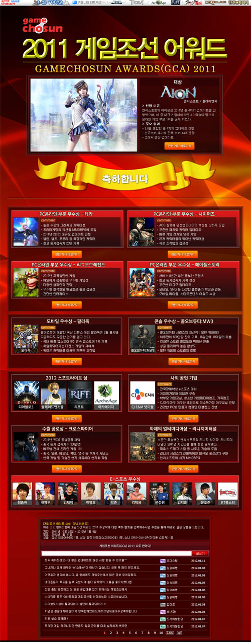 ... 이 어워드는 해당연도출시된 게임만을 대상으로 진행되는 기존 시상 방식을 탈피, 현재 서비스되고 있는 게임 전체를 잠정적 후보군으로 선정해 개별 타이틀의 인기 척도를 평가하는 특징을 갖고 있습니다. 어워드와 함께 진행됐던 'GCA2011 나도한마디 축하 이벤트'에 참여해