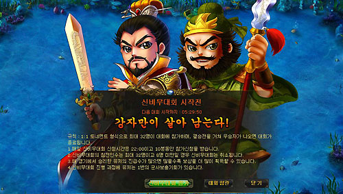 ... 신 비무대회 시스템은 최대 32명의 유저가 참여 할 수 있으며, 기존의 무장 한 명만 보내는 비무대회와는 달리 소유한 무장 모두가 출전 할 수 있다. 신 비무대회는 참여만 해도 상점에서 아이템 구매가 가능한 전공을 받을 수 있으며, 16강에 진출 하면 전공과 함께 게임 아이템