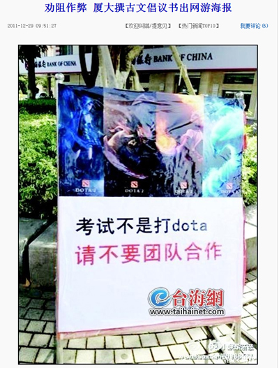 ... 이 포스터는 '시험은 도타(Dota)가 아니다. 협력전은 자제해달라'라는독특한 문구를 세겨 큰 인기를 얻고 있다. 보도에 따르면 포스터를 제작한 하먼대학교 학생부처는올해교내 도타 게임대회가 열리는 등 인기가 많은 것을 감안해 이 같은 포스터를 제작하게 됐다고 설명했다