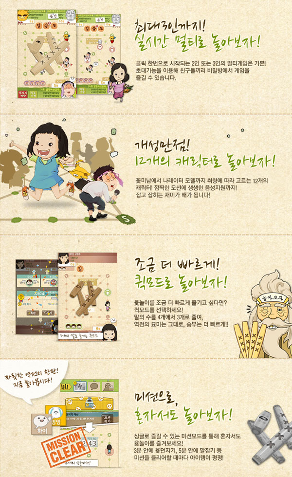 ... 여기에 미션모드를 통해 혼자서도 즐길 수도 있으며, 빠른 게임 진행을 위해 퀵모드도 지원, 편의성을 더하고 있다. 또, 12개의 개성 넘치는 캐릭터를 수집해 윷놀이 말로 사용할 수 있도록 게임을 감각적으로 진화시켜, 신선하고 다채로운 재미를 선사한다. NHN 한게임 스