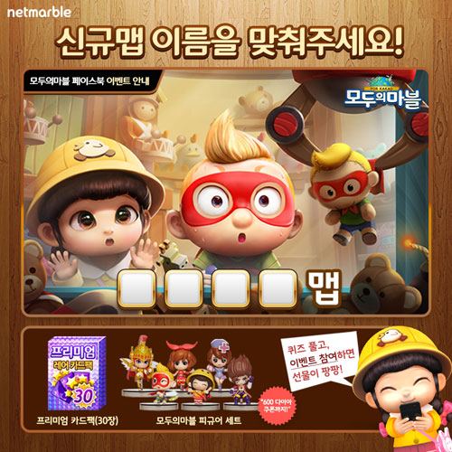 ...com/netmarblemoma)을 통해 이달 말 공개 예정인 신규 맵을 맞추는 퀴즈 이벤트를 진행 중이다. 해당 이벤트는 '모두의마블'을 즐기는 이용자라면 누구나 페이스북에 댓글을 남기는 방식으로 참여 가능하다. 넷마블은 해당 게시물의 좋아요 3만 달성 시, 이름을 맞춘 이