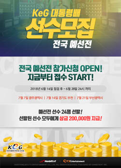 ... 24명의 결선 진출자들은 오는 8월 19일부터 20일까지 이틀간 인천 송도 컨벤시아에서 열리는 제10회 대통령배 KeG의 전국 결선에서 오디션 최강자를 가리게 된다. 오디션은 결선 참가 선수들에게 1위 200만원, 2위 150만원, 3위 100만원, 4위 70만원