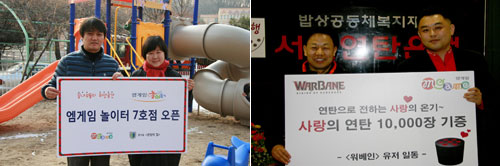 ... 먼저 엠게임은 경기도 안양시에 위치한 아동보육시설 안양의 집에 시소, 그네, 슬라이드 놀이대 등이 있는 7번째 놀이터를 지난 27일 오픈 했다. 엠게임 놀이터는 소외계층 아동들의 성장 발달에 도움을 줄 수 있는 공간을 마련하고 이를 통해 건전한 놀이문화를 전파하고자 201