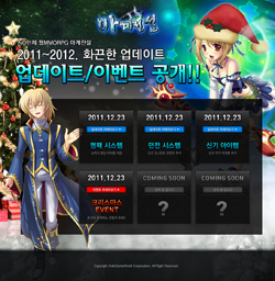 ... 함께 매시 진행되는 토벌전에도 신규 컨텐츠를 추가했으며 이전 지스타에서 지급했던 카드덱의 쿠폰번호 입력가능 기간을 2012년 2월 28일까지로 연장했다. 이번 이벤트는 크리스마스 기간에 경험치 2배, 드랍률 2배를 적용하고 접속만 하면 무조건 1만 2천원 상당의 캐시템을 지