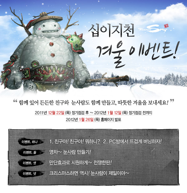 ... 또, 총 3종류 갑자 전용 망토와 함께 착용레벨 33갑자 아이템을 상위단계로 승격할 수 있는 승격시스템이 업데이트했다. 십이지천은 겨울을 맞아오늘부터 내년 1월 12일까지 다양한 이벤트도 진행한다. 우선, 신규 가입 유저가 기존 유저를 추천하고 지정 레벨을 달성하면 신규