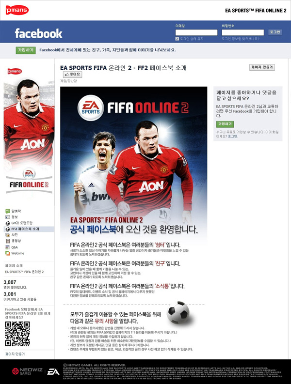 ... 유저들은 공식 페이스북을 통해 게임에 관련된 소식을 실시간 확인할 수 있고, 이용자들간 자유로운 의사소통 및 정보 공유가 가능해졌다. 이와 함께네오위즈게임즈는 피파2 페이스북에서 좋아요를 선택한 이용자들을 대상으로 유럽에서 활약 중인 한국 축구 선수의 사인볼 및 게임 아이템