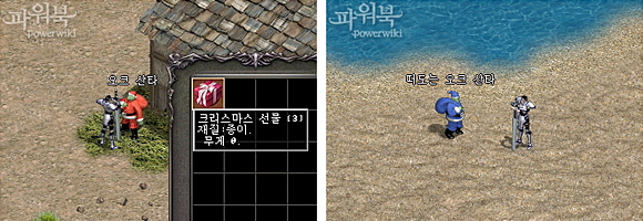 ... ▲ 크리스마스 이벤트로 만날 수 있는 오크 산타 (출처 : 리니지 파워북) 각 마을에 등장하는 ‘오크 산타’ NPC는 ‘크리스마스 양말’의 수에 따라 ‘크리스마스 선물 상자’ 아이템을 나눠 준다. 또 크리스마스 이브부터 ‘라온의 최고급 반지’를 교환해주기도 한다. 이와