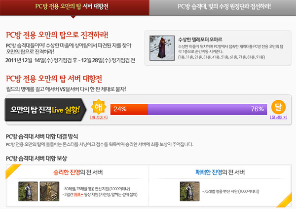 ... 총 51개 서버를 2개 해와 달의 진영으로 나누고 이벤트 던전인 오만의 탑에서 잡은 숫자에 따라 승패가 결정되며, 승리한 진영에는 고레벨 영웅변신과 전투에 유용한 버프가 주어진다. 15일부터 20일까지는 전국 PC방에 직접 찾아가 고급 장갑, 마우스 패드, 고급 환상의 큐브