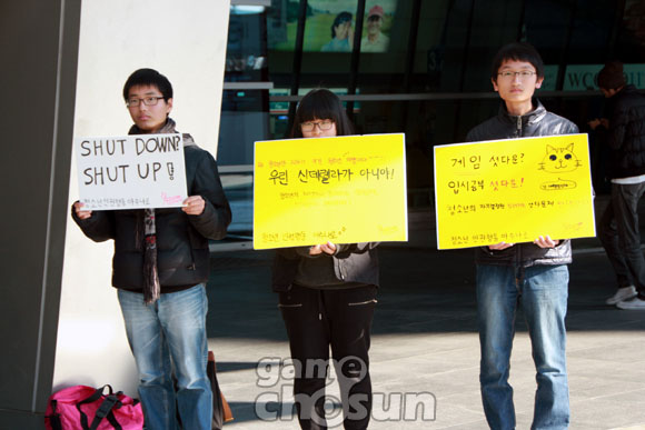 ... 11일 '월드사이버게임즈(WCG)' 2011 그랜드파이널 결승전이 열리고 있는 부산 벡스코(BEXCO) 앞에 부산의 청소년들이 게임 셧다운제에 반대하는 피켓을 들고 침묵시위를 벌이고 있다. [부산=이시우 기자 siwoo@chosun. com] [gamechosun
