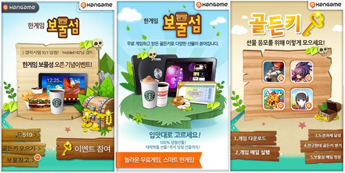 ... 해당 앱에서 이벤트 참여를 선택하고 원하는 선물에 응모하는 간단한 방식으로 이용할 수 있다. 친구끼리 선물도 가능하다. 이벤트 응모에 쓰이는 '골든키'는 한게임의 스마트폰 게임을 다운로드 받거나 실행할 때 자동 지급되며 보물섬을 매일 방문하면 추가 획득된다