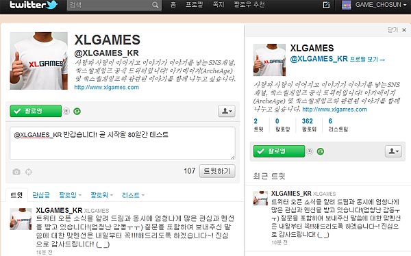 ... "최고의 게임회사가 되기 위해 SNS채널을 통하여 여러분과 많은 이야기를 주고받고 싶다"는 것이 엑스엘게임즈 공식 트위터의 첫 메시지다. 회사측은 공식 트위터 오픈 소식을 '아키에이지' 회원들에게 메일링 및 SMS를 통해 알렸으며 개설 계기와 직원들이 손수 만든 프로필