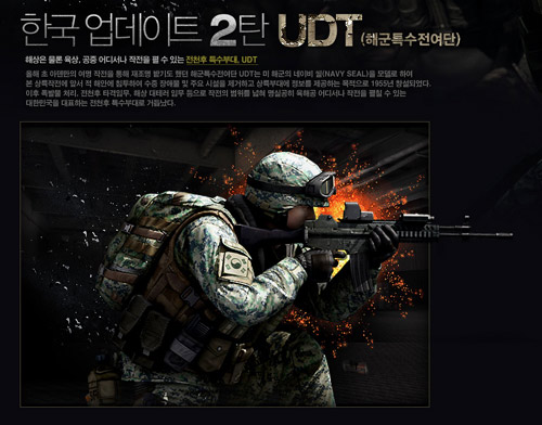... '스페셜포스2'는 지금까지 미국 '델타포스', 멕시코 '가페', 영국 'SAS', 러시아 '스페츠나츠', 프랑스 '지젠느' 등 각국을 대표하는 부대를 게임 속에서 선보여왔으며, 이달 8일 업데이트를 통해 우리나라의 특수부대인 'UDT(해군특수전여단)'를 등장시킬 예정이다.