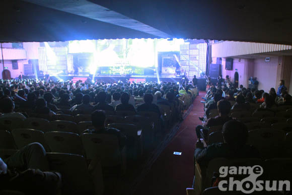 ... ▲ 꽉찬 관객들의 모습. 뒤쪽과 왼쪽에도 많은 관객들이 모여있다. ▲ '불타는 GSL로고' 왼편에 정지훈 선수의 긴장한 얼굴이 화면에 비친다