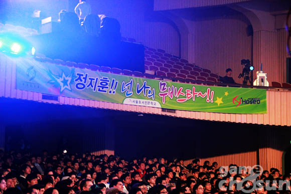 ... ▲ 서울호서전문학교 학생 및 관계자들이 준비한 NS호서 정지훈을 응원하는 플랜카드 ▲ FXO팀과 게이밍기기 업체 레이저가 제작한 이동녕 플랜카드 ▲ 정지훈 선수의 가족과 여자친구. 정지훈 선수가 직접 전한 메세지를 들고 있다. ▲ 정지훈을 응원하는 사람들